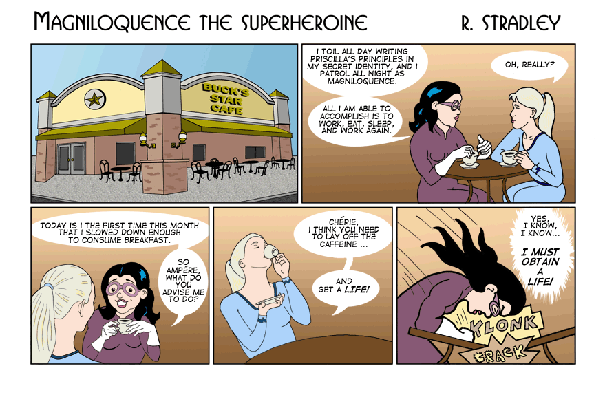 We introduce Buck’s Star Café on the square, where Wonder Falls gathers to drink tea or coffe and kibbutz. Magniloquence can be found there many mornings after a long night of patrolling Wonder Falls with a cup of tea. Ampére often joins her for a cup of morning coffee. Here we learn that Magniloquence needs a life. -- Robert Stradley, the Weekend Artist. |