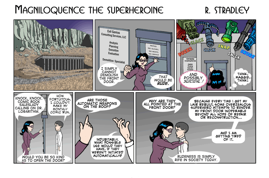 © 2013-2020. Magniloquence TM the Superheroine is written and illustrated by Robert Stradley, Characters and elements of Magniloquence are TM and © 2013-2020 Robert Stradley. All rights reserved. Graphic novels are published by Twisted Tail Productions PO box 9778 Wichita Falls, Texas, USA 76308. All names, characters, places, and events are fictitious and are meant to be treated as such. Any resemblance to actual persons past, present, or future is entirely coincidental. Any tongue-in-cheek reference to existing comics is purely intentional and readers are encouraged to ferret them out. If you cannot find any, you need to read more comics. If you can read this, you probably don't need new glasses.