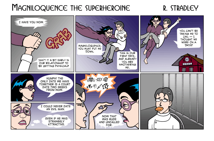 © 2013-2020. Magniloquence TM the Superheroine is written and illustrated by Robert Stradley, Characters and elements of Magniloquence are TM and © 2013-2020 Robert Stradley. All rights reserved. Graphic novels are published by Twisted Tail Productions PO box 9778 Wichita Falls, Texas, USA 76308. All names, characters, places, and events are fictitious and are meant to be treated as such. Any resemblance to actual persons past, present, or future is entirely coincidental. Any tongue-in-cheek reference to existing comics is purely intentional and readers are encouraged to ferret them out. If you cannot find any, you need to read more comics. If you can read this, you probably don't need new glasses.