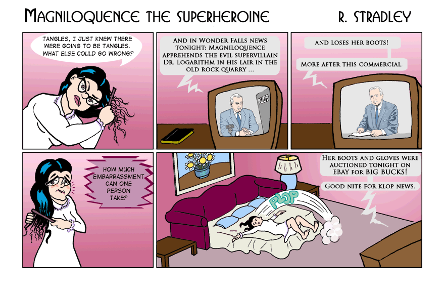© 2013-2020. Magniloquence TM the Superheroine is written and illustrated by Robert Stradley, Characters and elements of Magniloquence are TM and © 2013-2020 Robert Stradley. All rights reserved. Graphic novels are published by Twisted Tail Productions PO box 9778 Wichita Falls, Texas, USA 76308. All names, characters, places, and events are fictitious and are meant to be treated as such. Any resemblance to actual persons past, present, or future is entirely coincidental. Any tongue-in-cheek reference to existing comics is purely intentional and readers are encouraged to ferret them out. If you cannot find any, you need to read more comics. If you can read this, you probably don't need new glasses.