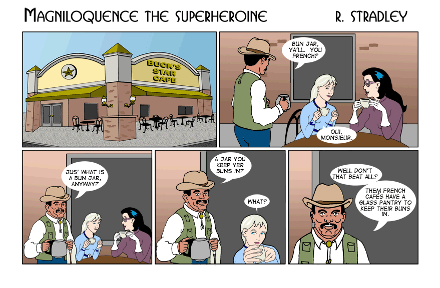 © 2013-2020. Magniloquence TM the Superheroine is written and illustrated by Robert Stradley, Characters and elements of Magniloquence are TM and © 2013-2020 Robert Stradley. All rights reserved. Graphic novels are published by Twisted Tail Productions PO box 9778 Wichita Falls, Texas, USA 76308. All names, characters, places, and events are fictitious and are meant to be treated as such. Any resemblance to actual persons past, present, or future is entirely coincidental. Any tongue-in-cheek reference to existing comics is purely intentional and readers are encouraged to ferret them out. If you cannot find any, you need to read more comics. If you can read this, you probably don't need new glasses.