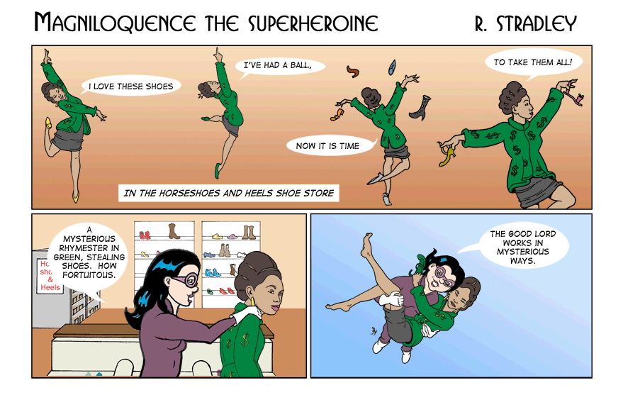 © 2013-2020. Magniloquence TM the Superheroine is written and illustrated by Robert Stradley, Characters and elements of Magniloquence are TM and © 2013-2020 Robert Stradley. All rights reserved. Graphic novels are published by Twisted Tail Productions PO box 9778 Wichita Falls, Texas, USA 76308. All names, characters, places, and events are fictitious and are meant to be treated as such. Any resemblance to actual persons past, present, or future is entirely coincidental. Any tongue-in-cheek reference to existing comics is purely intentional and readers are encouraged to ferret them out. If you cannot find any, you need to read more comics. If you can read this, you probably don't need new glasses.