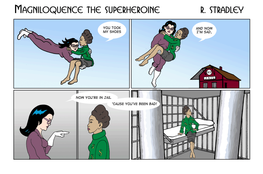 © 2013-2020. Magniloquence TM the Superheroine is written and illustrated by Robert Stradley, Characters and elements of Magniloquence are TM and © 2013-2020 Robert Stradley. All rights reserved. Graphic novels are published by Twisted Tail Productions PO box 9778 Wichita Falls, Texas, USA 76308. All names, characters, places, and events are fictitious and are meant to be treated as such. Any resemblance to actual persons past, present, or future is entirely coincidental. Any tongue-in-cheek reference to existing comics is purely intentional and readers are encouraged to ferret them out. If you cannot find any, you need to read more comics. If you can read this, you probably don't need new glasses.