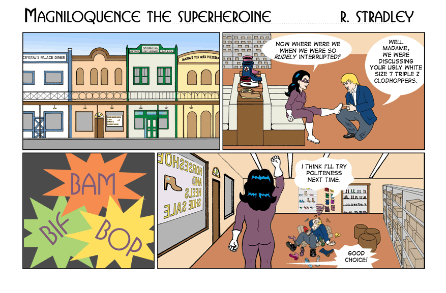 © 2013-2020. Magniloquence TM the Superheroine is written and illustrated by Robert Stradley, Characters and elements of Magniloquence are TM and © 2013-2020 Robert Stradley. All rights reserved. Graphic novels are published by Twisted Tail Productions PO box 9778 Wichita Falls, Texas, USA 76308. All names, characters, places, and events are fictitious and are meant to be treated as such. Any resemblance to actual persons past, present, or future is entirely coincidental. Any tongue-in-cheek reference to existing comics is purely intentional and readers are encouraged to ferret them out. If you cannot find any, you need to read more comics. If you can read this, you probably don't need new glasses.