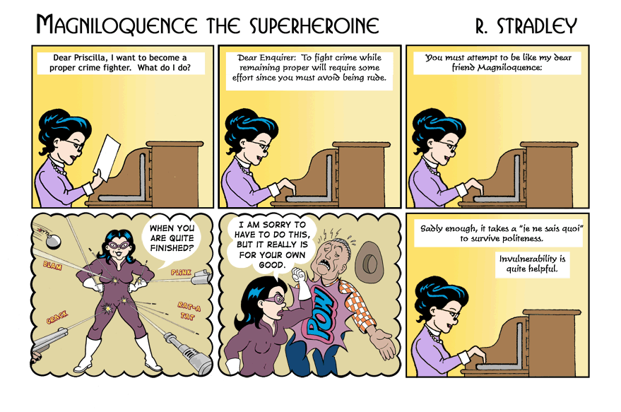 © 2013-2020. Magniloquence TM the Superheroine is written and illustrated by Robert Stradley, Characters and elements of Magniloquence are TM and © 2013-2020 Robert Stradley. All rights reserved. Graphic novels are published by Twisted Tail Productions PO box 9778 Wichita Falls, Texas, USA 76308. All names, characters, places, and events are fictitious and are meant to be treated as such. Any resemblance to actual persons past, present, or future is entirely coincidental. Any tongue-in-cheek reference to existing comics is purely intentional and readers are encouraged to ferret them out. If you cannot find any, you need to read more comics. If you can read this, you probably don't need new glasses.