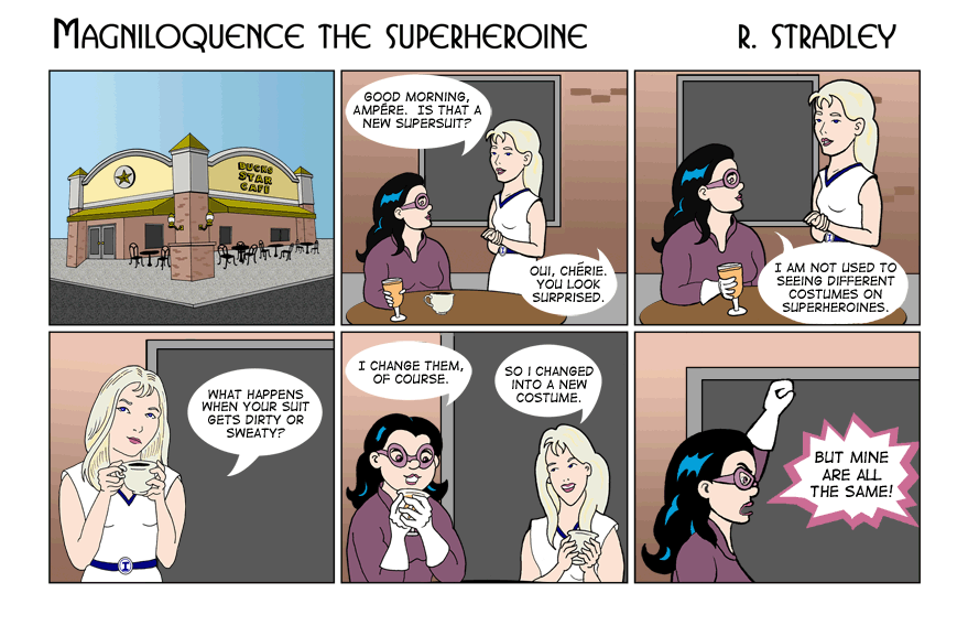 Another pet peeve of mine. Superheroines are not allowed to change suits -- it might confuse the dear readers. Of course, with hundreds of superheroines and superheroes in a comic's universe, it does start to get repetitive and differentiation becomes a problem. -- Robert Stradley, the Weekend Artist. |