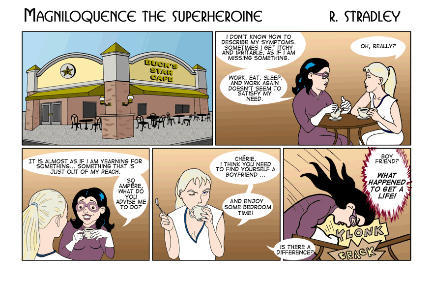 Ampére expounds on just what she thinks "Get a Life" means ... and the plot thickens. -- Robert Stradley, the Weekend Artist. |
