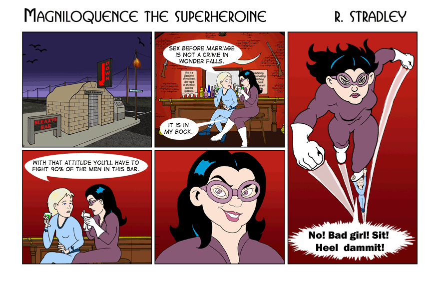 © 2013-2020. Magniloquence TM the Superheroine is written and illustrated by Robert Stradley, Characters and elements of Magniloquence are TM and © 2013-2020 Robert Stradley. All rights reserved. Graphic novels are published by Twisted Tail Productions PO box 9778 Wichita Falls, Texas, USA 76308. All names, characters, places, and events are fictitious and are meant to be treated as such. Any resemblance to actual persons past, present, or future is entirely coincidental. Any tongue-in-cheek reference to existing comics is purely intentional and readers are encouraged to ferret them out. If you cannot find any, you need to read more comics. If you can read this, you probably don't need new glasses.