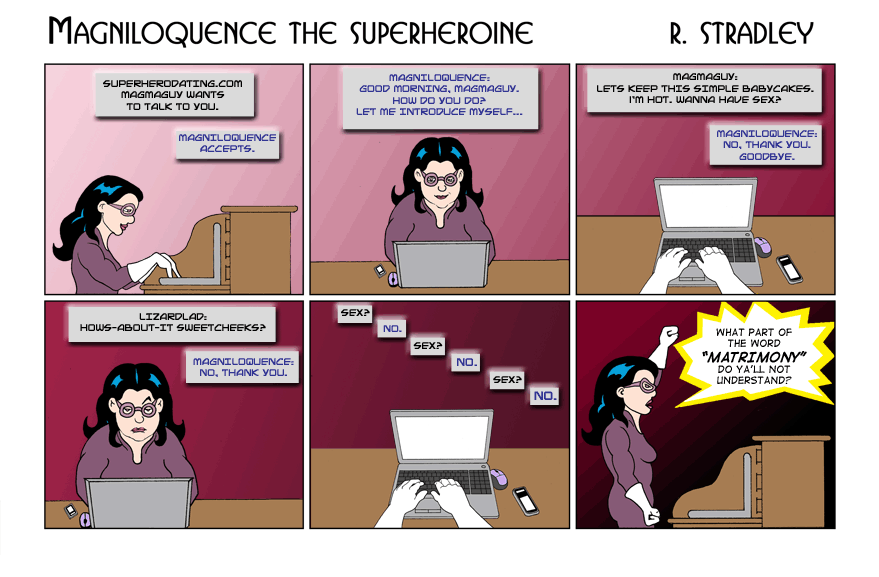 Magniloquence begins to understand the real purpose of Internet dating. It gets worse as Magniloquence goes out on the 13 Dates from Heck in the coming pages. -- Robert Stradley, the Weekend Artist. |