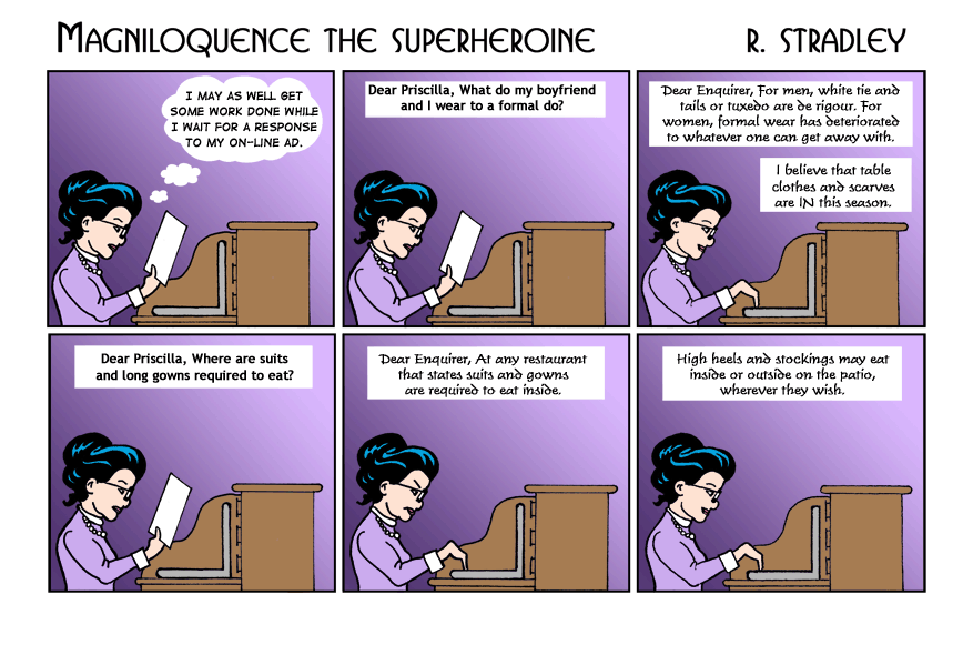 © 2013-2020. Magniloquence TM the Superheroine is written and illustrated by Robert Stradley, Characters and elements of Magniloquence are TM and © 2013-2020 Robert Stradley. All rights reserved. Graphic novels are published by Twisted Tail Productions PO box 9778 Wichita Falls, Texas, USA 76308. All names, characters, places, and events are fictitious and are meant to be treated as such. Any resemblance to actual persons past, present, or future is entirely coincidental. Any tongue-in-cheek reference to existing comics is purely intentional and readers are encouraged to ferret them out. If you cannot find any, you need to read more comics. If you can read this, you probably don't need new glasses.