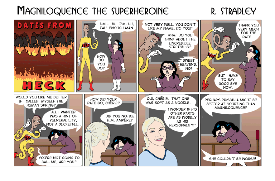 © 2013-2020. Magniloquence TM the Superheroine is written and illustrated by Robert Stradley, Characters and elements of Magniloquence are TM and © 2013-2020 Robert Stradley. All rights reserved. Graphic novels are published by Twisted Tail Productions PO box 9778 Wichita Falls, Texas, USA 76308. All names, characters, places, and events are fictitious and are meant to be treated as such. Any resemblance to actual persons past, present, or future is entirely coincidental. Any tongue-in-cheek reference to existing comics is purely intentional and readers are encouraged to ferret them out. If you cannot find any, you need to read more comics. If you can read this, you probably don't need new glasses.