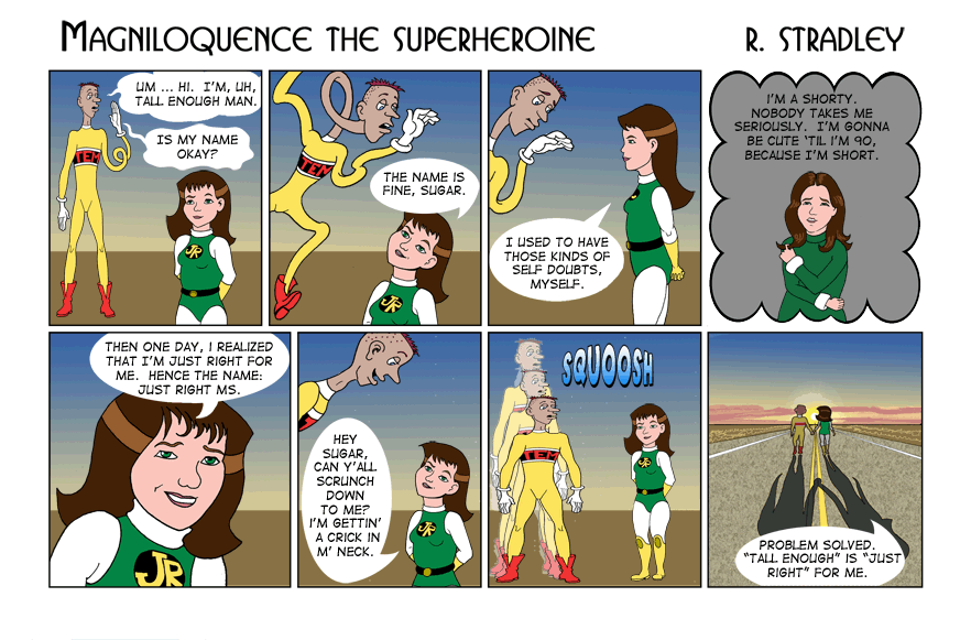 In response to reader request, here is Just Right Ms. for Tall Enough Man. Here is the original comic for Tall Enough Man for reference. -- Robert Stradley, the Weekend Artist. |