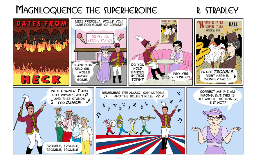 © 2013-2020. Magniloquence TM the Superheroine is written and illustrated by Robert Stradley, Characters and elements of Magniloquence are TM and © 2013-2020 Robert Stradley. All rights reserved. Graphic novels are published by Twisted Tail Productions PO box 9778 Wichita Falls, Texas, USA 76308. All names, characters, places, and events are fictitious and are meant to be treated as such. Any resemblance to actual persons past, present, or future is entirely coincidental. Any tongue-in-cheek reference to existing comics is purely intentional and readers are encouraged to ferret them out. If you cannot find any, you need to read more comics. If you can read this, you probably don't need new glasses.