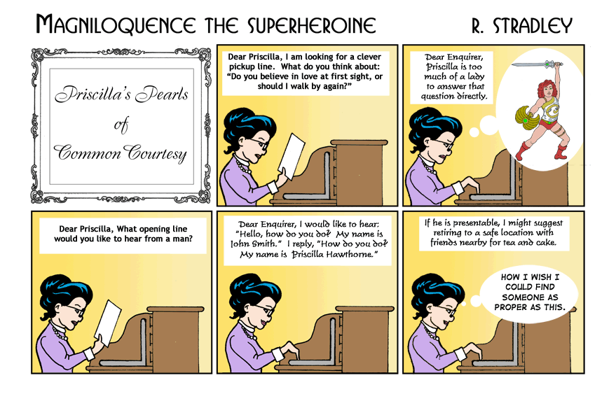 Priscilla expounds on pick-up lines, and cringes over her recent Internet dates. -- Robert Stradley, the Weekend Artist. |