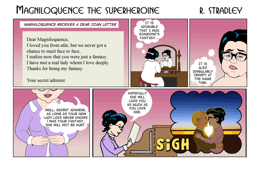 Magniloquence gets a Dear Joan letter from her secret admirer, while Priscilla dreams of her new love. . -- Robert Stradley, the Weekend Artist. |