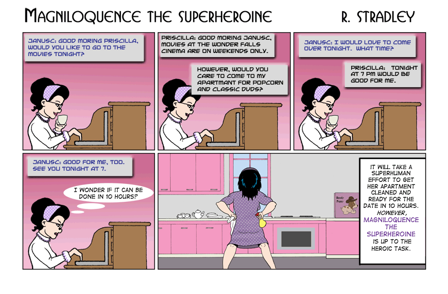 Priscilla's Pokey Dot cleaning dress from the 50's is scanned from a piece of fabric in my wife's stash . The kitchen colors and design are also 1950's. Things don't change very fast in Wonder Falls. One of the rules for writers is to write what you know. The last minute hurry up and clean is a way of life at our house.-- Robert Stradley, the Weekend Artist. |