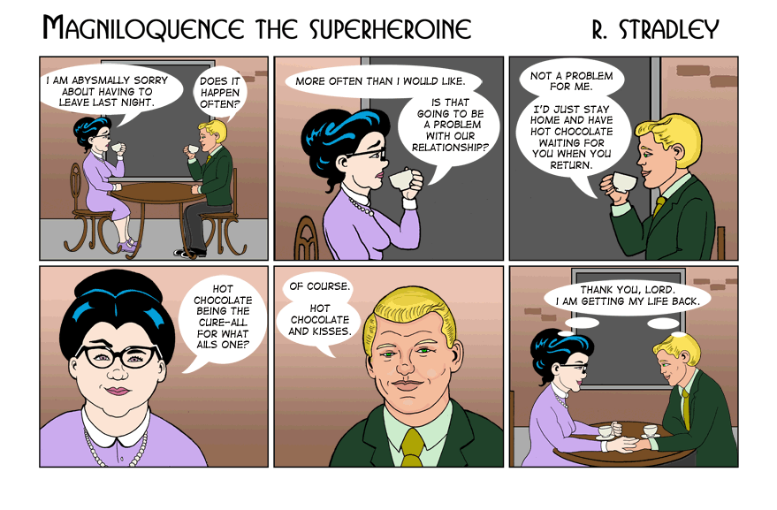 © 2013-2020. Magniloquence TM the Superheroine is written and illustrated by Robert Stradley, Characters and elements of Magniloquence are TM and © 2013-2020 Robert Stradley. All rights reserved. Graphic novels are published by Twisted Tail Productions PO box 9778 Wichita Falls, Texas, USA 76308. All names, characters, places, and events are fictitious and are meant to be treated as such. Any resemblance to actual persons past, present, or future is entirely coincidental. Any tongue-in-cheek reference to existing comics is purely intentional and readers are encouraged to ferret them out. If you cannot find any, you need to read more comics. If you can read this, you probably don't need new glasses.