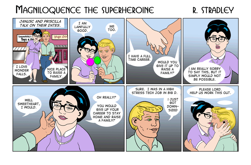 © 2013-2020. Magniloquence TM the Superheroine is written and illustrated by Robert Stradley, Characters and elements of Magniloquence are TM and © 2013-2020 Robert Stradley. All rights reserved. Graphic novels are published by Twisted Tail Productions PO box 9778 Wichita Falls, Texas, USA 76308. All names, characters, places, and events are fictitious and are meant to be treated as such. Any resemblance to actual persons past, present, or future is entirely coincidental. Any tongue-in-cheek reference to existing comics is purely intentional and readers are encouraged to ferret them out. If you cannot find any, you need to read more comics. If you can read this, you probably don't need new glasses.