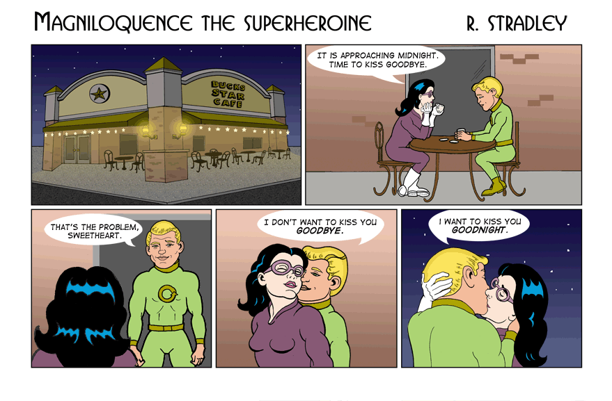 © 2013-2020. Magniloquence TM the Superheroine is written and illustrated by Robert Stradley, Characters and elements of Magniloquence are TM and © 2013-2020 Robert Stradley. All rights reserved. Graphic novels are published by Twisted Tail Productions PO box 9778 Wichita Falls, Texas, USA 76308. All names, characters, places, and events are fictitious and are meant to be treated as such. Any resemblance to actual persons past, present, or future is entirely coincidental. Any tongue-in-cheek reference to existing comics is purely intentional and readers are encouraged to ferret them out. If you cannot find any, you need to read more comics. If you can read this, you probably don't need new glasses.