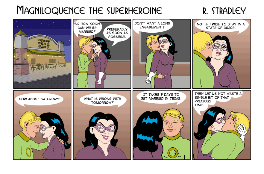 Magniloquence and Kinematic Man discuss setting the wedding date. This is the revised comic documented in Interlude 212, Discussions with the Author. .As you can see, she remains chaste but ready for marriage duties. -- Robert Stradley, the Weekend Artist. |