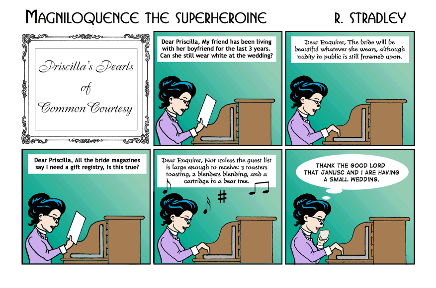Priscilla expounds on bridal perogatives, bridesmaid dresses, and Momzillas. -- Robert Stradley, the Weekend Artist. |