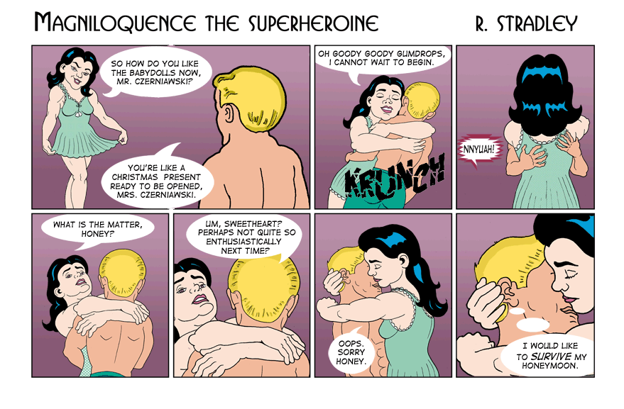 Sometimes Magniloquence doesn't remember her own strength. Surviving one's honeymoon is always a good idea. -- Robert Stradley, the Weekend Artist. |