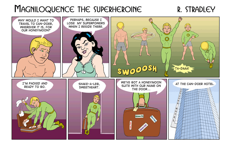 © 2013-2020. Magniloquence TM the Superheroine is written and illustrated by Robert Stradley, Characters and elements of Magniloquence are TM and © 2013-2020 Robert Stradley. All rights reserved. Graphic novels are published by Twisted Tail Productions PO box 9778 Wichita Falls, Texas, USA 76308. All names, characters, places, and events are fictitious and are meant to be treated as such. Any resemblance to actual persons past, present, or future is entirely coincidental. Any tongue-in-cheek reference to existing comics is purely intentional and readers are encouraged to ferret them out. If you cannot find any, you need to read more comics. If you can read this, you probably don't need new glasses.
