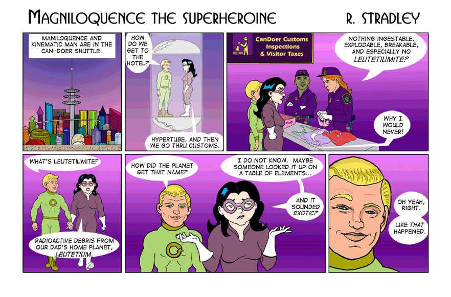 | We learn another tidbit about Magniloquence and MegaWoman: their dads were brothers from the planet Leutetium. -- Robert |