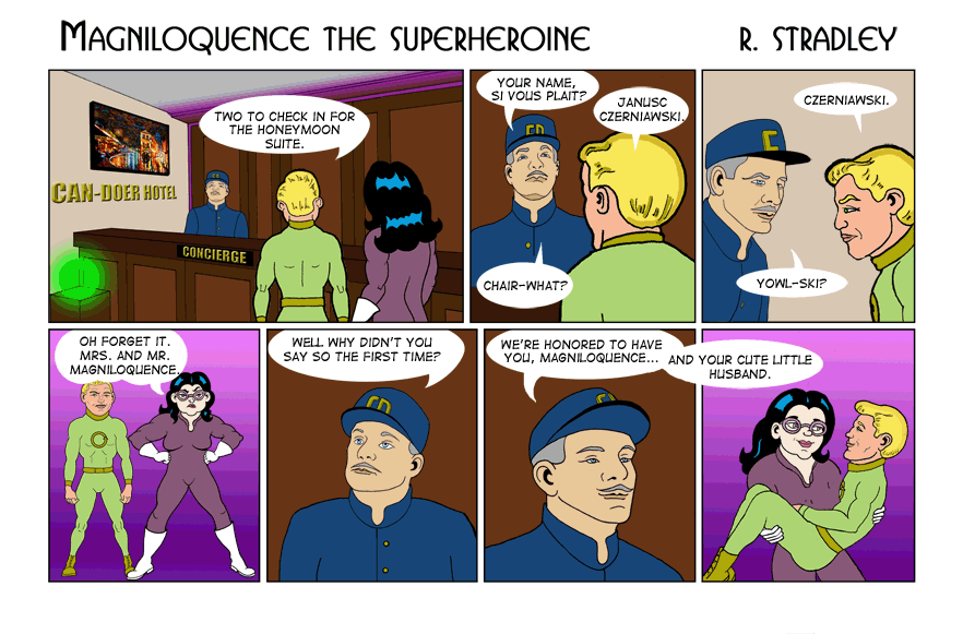 Janusc encounters a snooty concierge at the Can Doer Hotel, and Magniloquence steps in to save the day with a romantic role reversal.. -- Robert Stradley, the Weekend Artist. |
