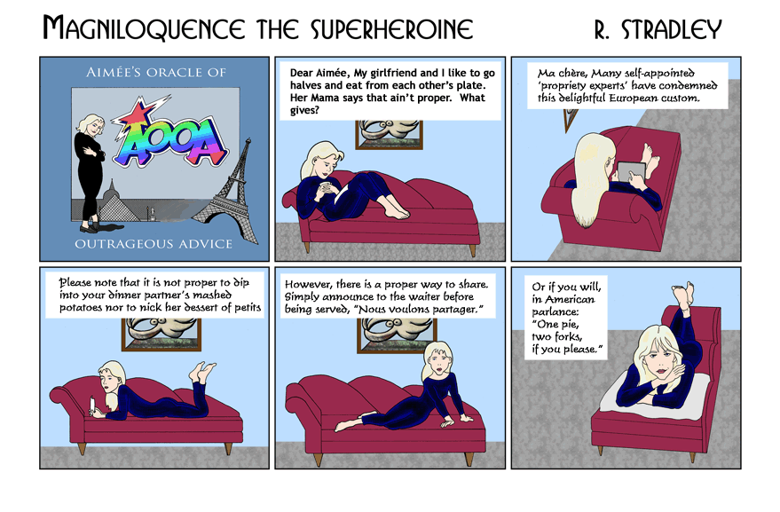 Nous voulons partager -- We would like to share -- is indeed an old and respected European custom. Not perhaps of high society, true, but typical in many a bistro or cafe. -- Robert Stradley, the Weekend Artist. |