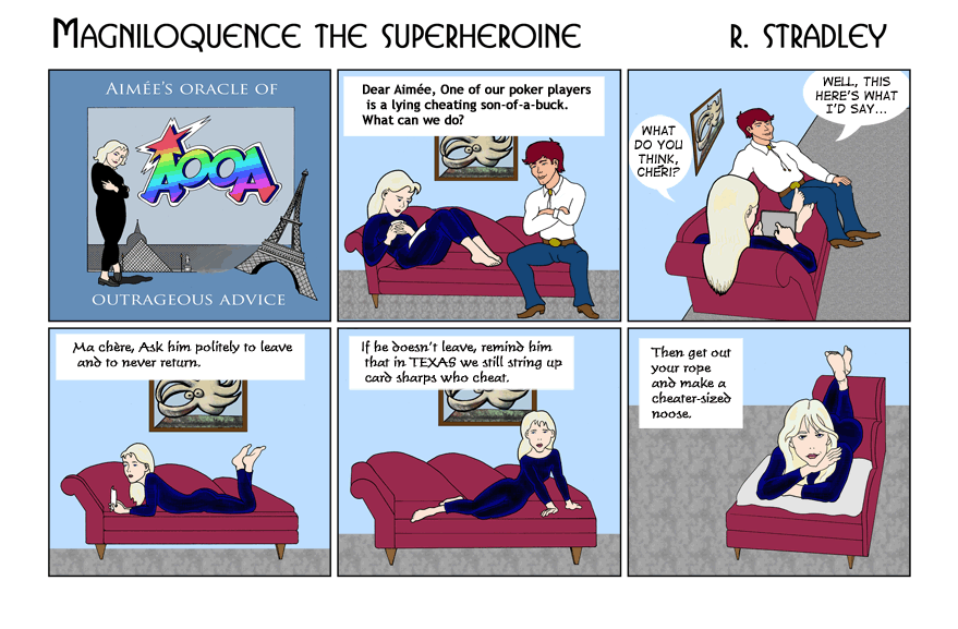 Aimée gives outrageous advice on lying, cheating poker players. -- Robert Stradley, the Weekend Artist. |