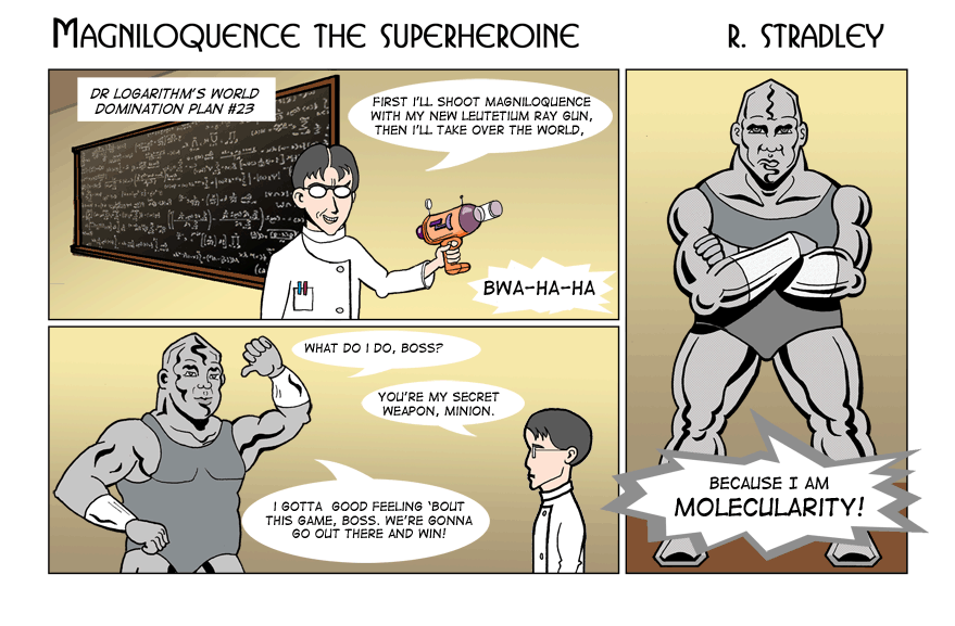 Introducing Molecularity, Dr. Logarithm's minion. Molecularity is a superstrong metal man. -- Robert Stradley, the Weekend Artist. |