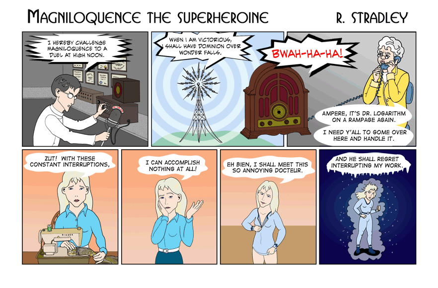 Dr. Logarithm challenges Magniloquence to a duel. Unknown to him, she is on her honeymoon in Can-Doer. Ampére takes the call from the Mayor and is annoyed. She powers up and prepares for the duel. -- Robert Stradley, the Weekend Artist. |