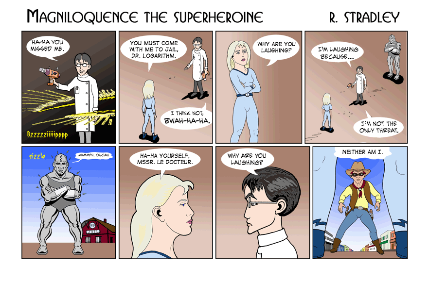 © 2013-2020. Magniloquence TM the Superheroine is written and illustrated by Robert Stradley, Characters and elements of Magniloquence are TM and © 2013-2020 Robert Stradley. All rights reserved. Graphic novels are published by Twisted Tail Productions PO box 9778 Wichita Falls, Texas, USA 76308. All names, characters, places, and events are fictitious and are meant to be treated as such. Any resemblance to actual persons past, present, or future is entirely coincidental. Any tongue-in-cheek reference to existing comics is purely intentional and readers are encouraged to ferret them out. If you cannot find any, you need to read more comics. If you can read this, you probably don't need new glasses.