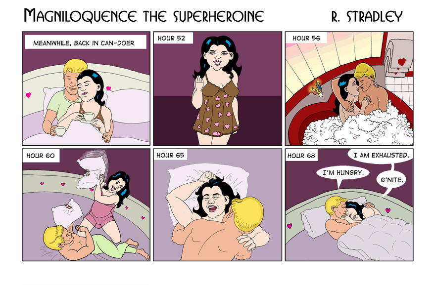 Are they doing something unusual in panel 5? Laughter is not normally a great response to a man's love making. It tends to make them grumpy. S.B. 25Feb18 Yes, thank you for asking. Janusc is tickling Priscilla with his scratchy beard stubble. This is something which, as an invulnerable superheroine, she is not familiar. I imagine that in this instance, she would find the sensation new, interesting, and a bit uncomfortablely exciting. As for laughter, I find my wife's laughter delightful at any time and a piquant accompanyment to loving.-- Robert |