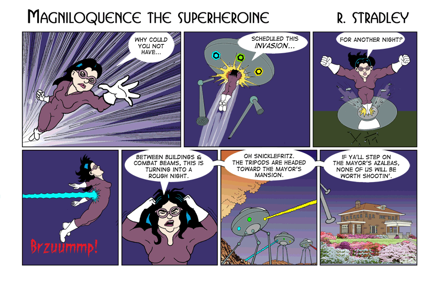 Magniloquence is fighting Alien Tripods; winning some and losing some. But when they head towards the Mayor's mansion, she is ready to pull out her hair in frustration. Once again, under stress, Magniloquence shows her West Texan roots -- "If ya'll step on the Mayor's azaleas, none of us will be worth shootin'." -- Robert Stradley, the Weekend Artist. |
