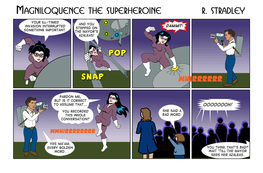© 2013-2020. Magniloquence TM the Superheroine is written and illustrated by Robert Stradley, Characters and elements of Magniloquence are TM and © 2013-2020 Robert Stradley. All rights reserved. Graphic novels are published by Twisted Tail Productions PO box 9778 Wichita Falls, Texas, USA 76308. All names, characters, places, and events are fictitious and are meant to be treated as such. Any resemblance to actual persons past, present, or future is entirely coincidental. Any tongue-in-cheek reference to existing comics is purely intentional and readers are encouraged to ferret them out. If you cannot find any, you need to read more comics. If you can read this, you probably don't need new glasses.