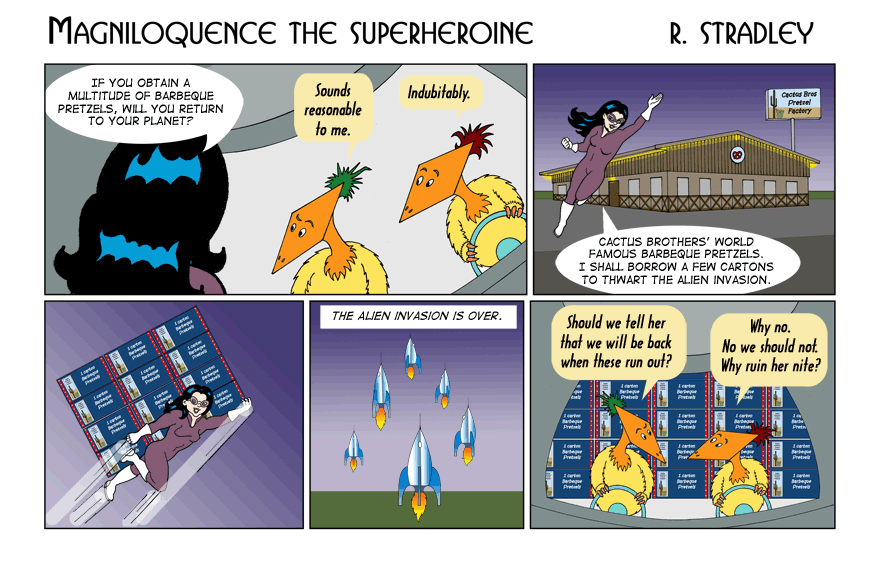 © 2013-2020. Magniloquence TM the Superheroine is written and illustrated by Robert Stradley, Characters and elements of Magniloquence are TM and © 2013-2020 Robert Stradley. All rights reserved. Graphic novels are published by Twisted Tail Productions PO box 9778 Wichita Falls, Texas, USA 76308. All names, characters, places, and events are fictitious and are meant to be treated as such. Any resemblance to actual persons past, present, or future is entirely coincidental. Any tongue-in-cheek reference to existing comics is purely intentional and readers are encouraged to ferret them out. If you cannot find any, you need to read more comics. If you can read this, you probably don't need new glasses.