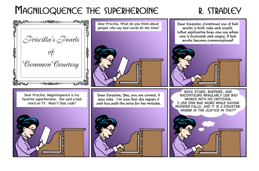Priscilla bemoans the injustice of the world holding Magniloquence to a much higher standard of behaviour. What she isn't remembering is that we need our heroines and heroes as big as we can get them -- we can't use them life size. -- Robert Stradley, the Weekend Artist. |
