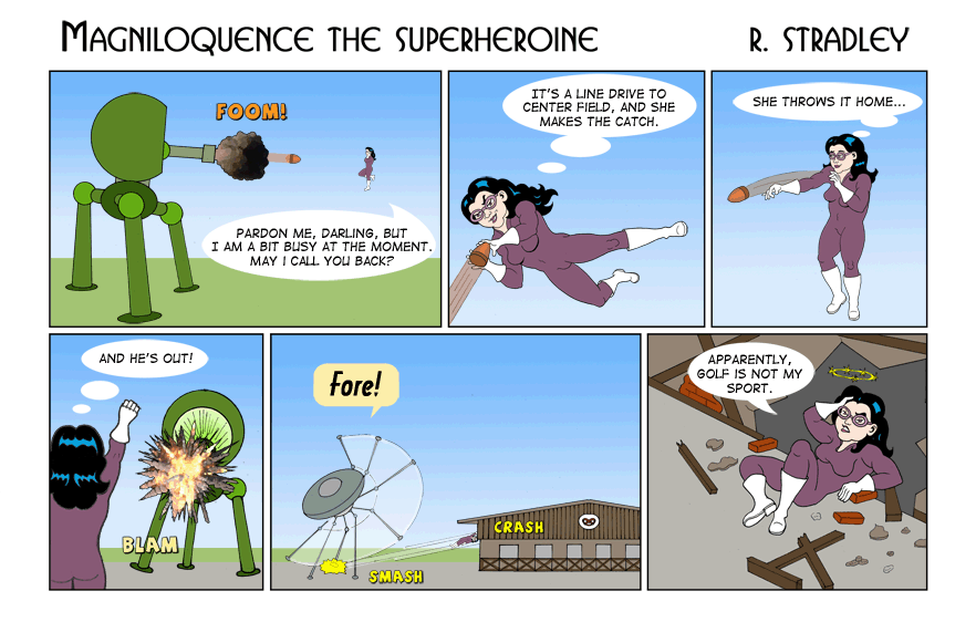 Magniloquence gets the infamous "can you stop for some groceries" phone call at an inopportune moment. This is one of the original comics envisioned back in 2013. -- Robert Stradley, the Weekend Artist. |