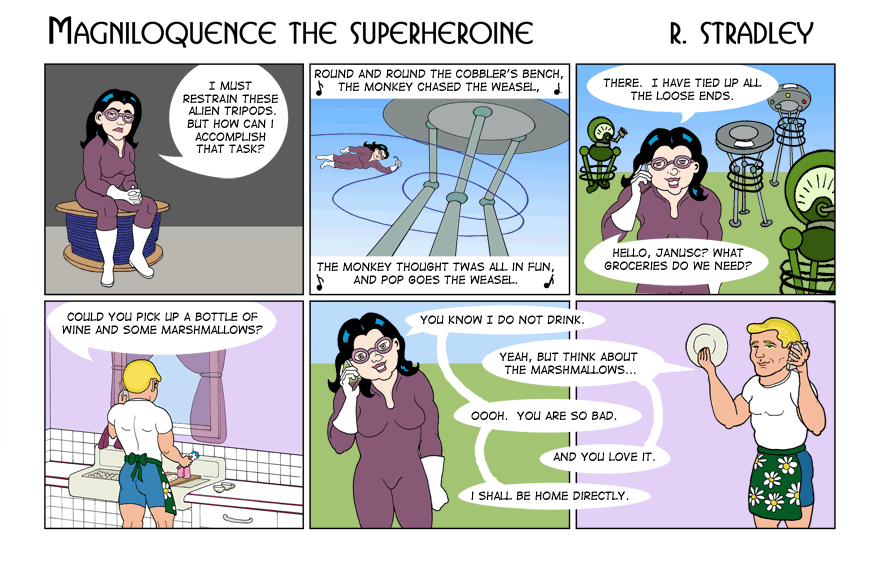 Magniloquence sings as she works to clean up the latest alien incursion. Janusc asks her to pick up wine and marshmallows. What an incentive to make it home from work early. -- Robert Stradley, the Weekend Artist. |
