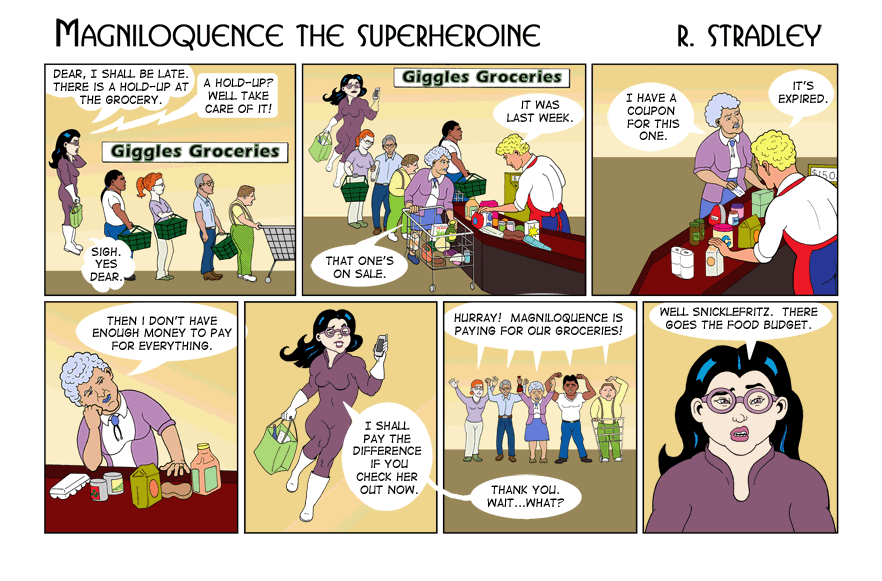 Magniloquence encounters a hold-up at Giggles Grocery Store that even she can't handle. -- Robert Stradley, the Weekend Artist. |
