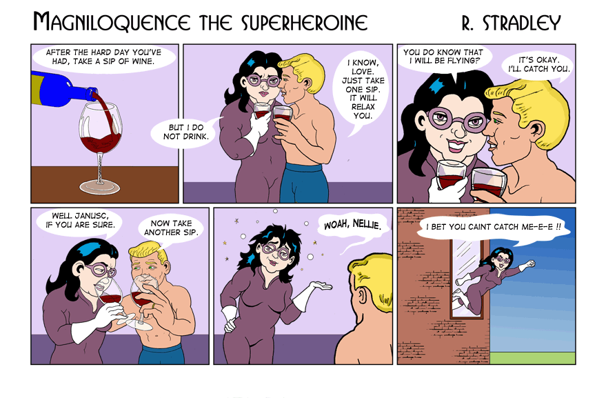 Magniloquence has some wine after a bad day, and she gets drunk. Janusc promises to catch her when she flys. -- Robert Stradley, the Weekend Artist. |