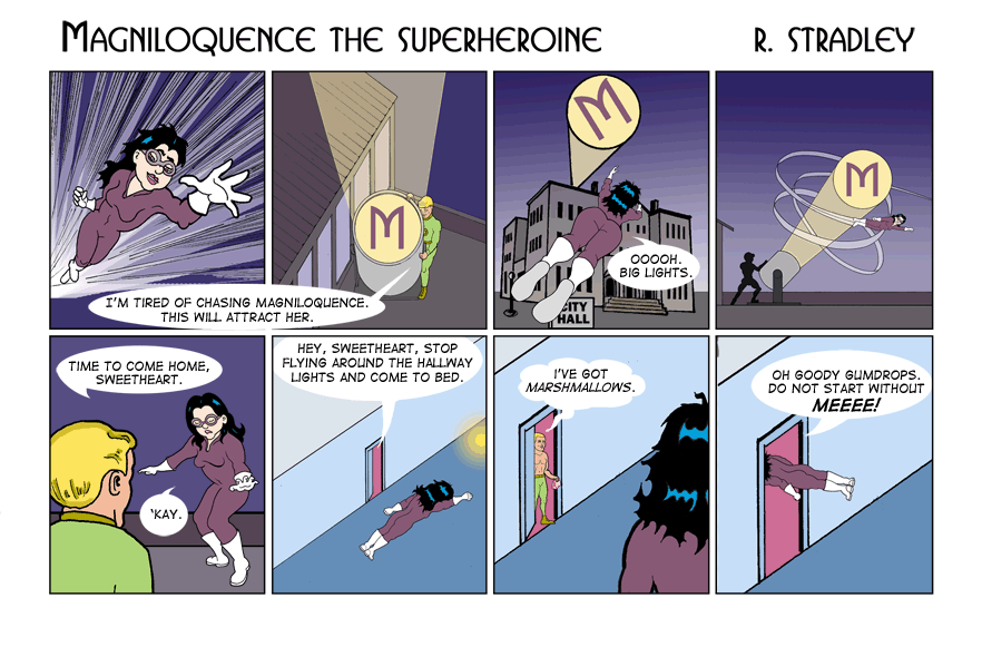 © 2013-2020. Magniloquence TM the Superheroine is written and illustrated by Robert Stradley, Characters and elements of Magniloquence are TM and © 2013-2020 Robert Stradley. All rights reserved. Graphic novels are published by Twisted Tail Productions PO box 9778 Wichita Falls, Texas, USA 76308. All names, characters, places, and events are fictitious and are meant to be treated as such. Any resemblance to actual persons past, present, or future is entirely coincidental. Any tongue-in-cheek reference to existing comics is purely intentional and readers are encouraged to ferret them out. If you cannot find any, you need to read more comics. If you can read this, you probably don't need new glasses.