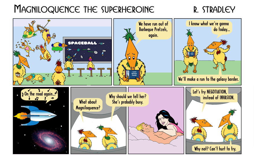 The Aliens are back, but they decide to negotiate instead of invade. This means Magniloquence gets to sleep in for another night. . -- Robert Stradley, the Weekend Artist. |