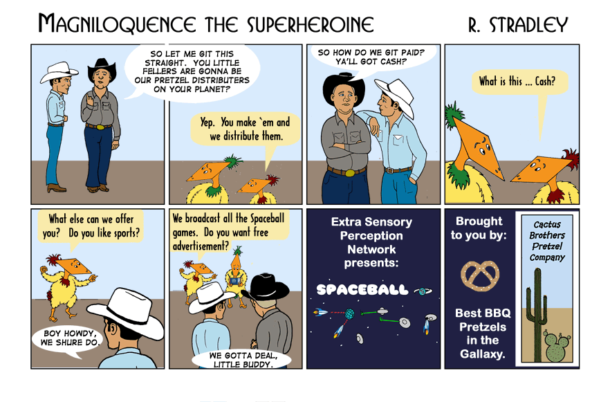 The "little guys" make a deal with the Cactus Brothers for bar-be-que pretzels and The Cactus Brothers' Bar-be-que Pretzels become the best in the galaxy. -- Robert Stradley, the Weekend Artist. |