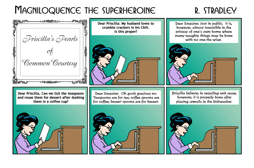 Priscilla expounds on crackers and spoons in this, the first of the PPCC Interludes. -- Robert Stradley, the Weekend Artist. |
