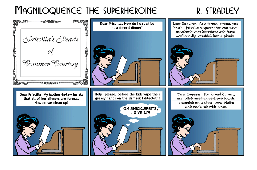 Why is Priscilla irritated over the formal cleanup? Anyone who has been subjected to formal dinners understands that finger bowls are FLAO and napkins are for tapping or blotting, NOT cleaning. Anyone stupid enough to subject children to formal dinners deserves the Chaos that normally ensues. -- Robert Stradley, the Weekend Artist. |