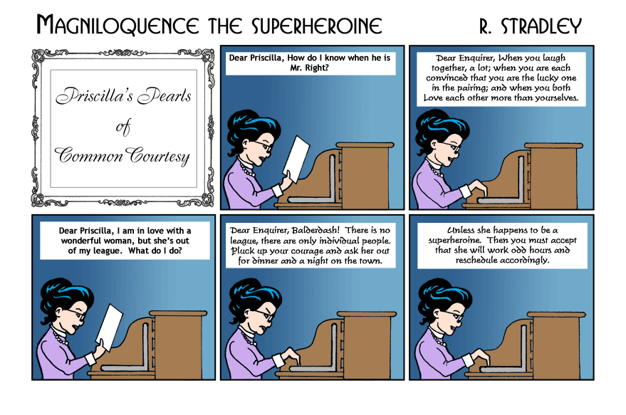 Priscilla expounds on Mister Right, and Ms. Right, and superheroines. . -- Robert Stradley, the Weekend Artist. |