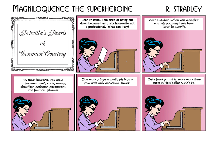 Priscilla weighs in with another pet peeve of mine.Whether househusband or housewife, the at-home caregiver is worthy of respect for muliple jobs well done. It is a sad commentary on American society that feminists and chauvanists are so similar in their distain for this underpaid mission-critical function.. -- Robert Stradley, the Weekend Artist. |